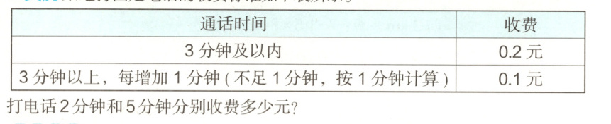 $ \boxed{ 解题指导}$打电话2分钟属于3分钟以内,收费0.2元。打电话5分钟,可以分为第一阶段的3分钟和超过3分钟的2分钟,第一阶段的3分钟共收费0.2元;而另外的2分钟,每分钟0.1元,$0.1 × 2 = 0.2(元)$,两部分相加得0.4元。