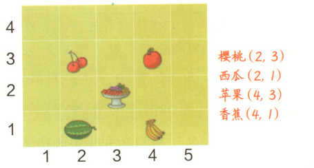 1. 果盘用数对(3,2)表示。你能照样子用数对表示其他几个水果的位置吗?