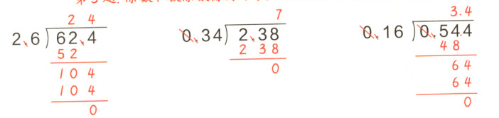 1. 移动除数小数点,使它变成整数,除数的小数点向右移动几位,被除数的小数点也向右移动几位(位数不够的,在被除数末尾用0补足)。