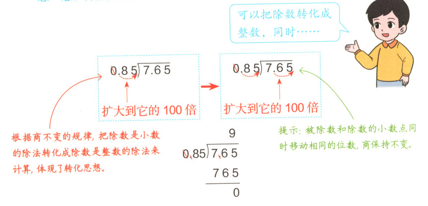 3. 以7.65÷0.85为例:0.85→85(小数点右移2位),7.65→765(小数点右移2位),计算765÷85=9,故7.65÷0.85=9。