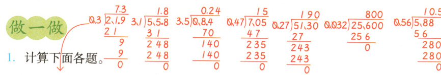 2. 除数的小数点向右移动几位, 被除数的小数点也向右移动几位(位数不够的,在被除数的末尾用 0 补足);