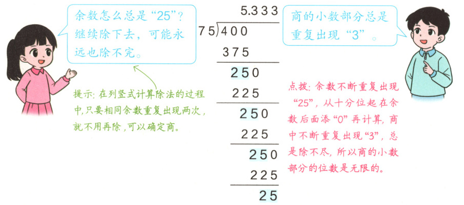 $ \begin{array}{r}5.333\ldots \\75\overline{)400.000} \\375 \\\hline 250 \\225 \\\hline 250 \\225 \\\hline 250 \\225 \\\hline 25 \\\end{array}$