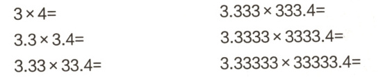对于$3.33333×33333.4$,因为第一个因数有$5$个$3$,所以$3.33333×33333.4 = 111111.222222$。