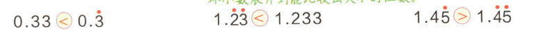 比较两个小数的大小,先看整数部分,整数部分都是$0$,再看十分位,都是$3$,接着看百分位,$0.33$的百分位是$3$,$0.\dot{3}=0.333·s$的百分位是$3$,千分位$0.33$是$0$,$0.\dot{3}$的千分位是$3$,因为$0.33 = 0.330$,$0.330\lt0.333·s$,所以$0.33\lt0.\dot{3}$。