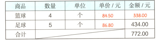 所以表格中足球单价为$86.80$元,合计金额为$772.00$元。