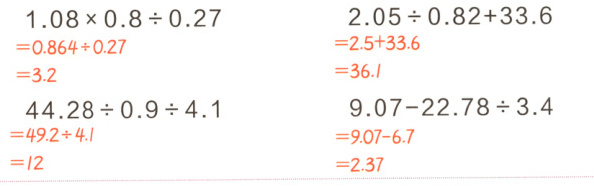 先算乘法$1.08×0.8 = 0.864$,再算除法$0.864÷0.27=\frac{0.864}{0.27}=\frac{864}{270}=3.2$。