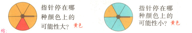 转动指针。 提示:哪种颜色的面积大,指针停在那种颜色上的可能性就大,反之就小。