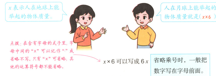 $x × 6$可以写成$6x$ 省略乘号时,一般把数字写在字母前面。