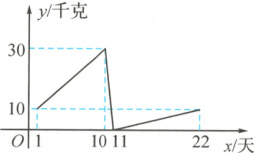 10. 某水果超市从 12 月 15 日至 1 月 5 日(共计 22 天,12 月 15 日为第 1 天,12 月 16 日为第 2 天,…,1 月 5 日为第 22 天),某种苹果的销售量$y$(千克)随时间$x$(天)变化的函数图象如图所示,则该超市在 12 月 20 日卖出了这种苹果