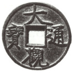 12. (百科)宋徽宗赵佶是北宋著名的书法家,右图为他在位时期所使用过的钱币,上面是他亲笔书写的瘦金体文字(