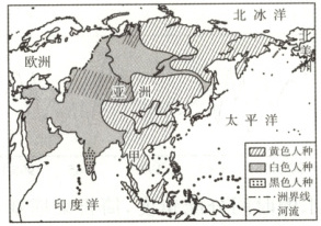 亚洲地域辽阔,自然环境、人文环境差异显著。下图示意亚洲人种分布。据此完成 4~6 题。