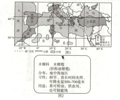 经贸和旅游是现今海上丝绸之路(简称“一路”)实现人类文明交流的主要方式。图1为地中海周边地区简图,图2为植物简介挂牌。读图,回答下列问题。