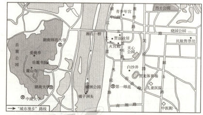 (1)读图可得,小桐是在长沙市区城市漫步。小桐从天心公园出发,最终抵达橘子洲头。据“上北下南,左西右东”可得,此次城市漫步的终点位于起点的西南方。