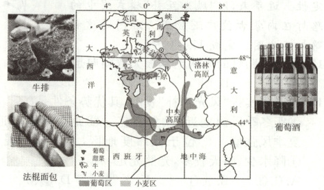 (3)法国位于欧洲西部。读图可知,A地属于温带海洋性气候,有利于多汁牧草生长,牛肉产量大,原料充足,且人口稠密,市场广阔,适宜发展畜牧业,盛产牛排;B为小麦产区,面包制作原料充足,且该地人口稠密,市场需求量大,盛产法棍面包;法国南部的C地中海沿岸,以地中海气候为主,夏季炎热干燥,光照充足,昼夜温差大,有利于葡萄种植,加之该地酿酒历史悠久,技术先进,因此盛产葡萄酒。