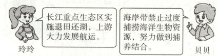 (5)玲玲的说法中,长江上游大力发展航运是错误的观点,长江上游多峡谷急流、落差大,不适合航运。贝贝的观点符合中国山水林田湖草生命共同体理念。