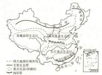(1)北方防沙带:主要位于西北地区,该地区最突出的自然环境特征是