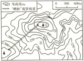 4.A 解析:读图分析,相对高度是指一个地点高出另一个地点的垂直距离,图示等高距为50米,“晒秋”观景栈道两端的海拔分别为500米和350米,两端的相对高度是150米。