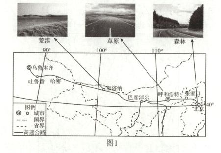 (2)读图可知,京新高速自东向西景观由森林变为草原,最后变成荒漠,其影响因素主要为降水逐渐减少。