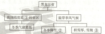 (3)冰雪资源就是金山银山,黑龙江省拥有得天独厚的冰雪资源。根据所学知识,黑龙江省是我国纬度最高的省区,加之临近冬季风的源地,冬季气温最低;气候为温带季风气候,冬季降雪多,积雪厚,雪期长。
