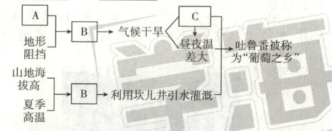 (4)根据所学知识可知,吐鲁番位于中国西北部,深居内陆,距海较远,④符合题意;由于地形阻挡,加上距海较远,因此湿润气流难以到达内陆地区,①符合题意;内陆地区降水较少,因此晴天多,光照充足,③符合题意;新疆地区北部有阿尔泰山脉,南部有天山山脉,因此高山冰雪融水丰富,②符合题意。