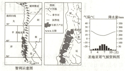 材料二 智利示意图与圣地亚哥气温曲线和降水量柱状图。