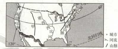 (1)美国地形呈南北纵列分布,西部甲为落基山脉,中部为中央大平原,地势平坦,东部为阿巴拉契亚山脉。墨西哥湾位于北回线附近,故在地势平坦的中部地区,每年春夏季,来自北冰洋的冷干气流与来自墨西哥湾的暖湿气流在此交汇,容易形成龙卷风。
