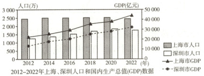 3. 关于2012—2022年上海、深圳人口和GDP的变化,表述正确的是(