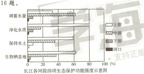16.D 解析:长江上游的栖息地功能是提供给当地生物的,因此一旦栖息地功能下降直接带来的问题是物种锐减,D正确;土壤污染、水体污染都是由于人类活动导致的,多出现在中下游地区,与上游的生物栖息地无关,旱涝灾害多出现在中下游的季风气候区,与上游的生物栖息地无关,排除A、B、C。