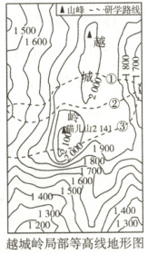 (2)读图可知,①穿越山峰,地势起伏大,行进较困难;②穿过的地势相对平坦,行进较轻松;③穿过山峰,且穿过的等高线数量多,行进较困难,所以①②③中轻松的是②。