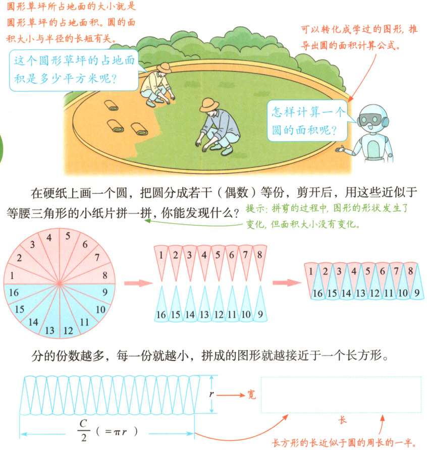 圆的周长的一半;半径;长;宽;圆的周长的一半;半径;$πr^2 $2;$S=\pi r^2$
