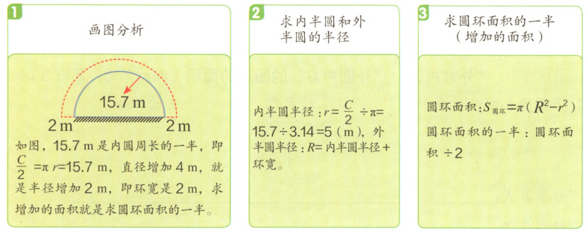 如图,15.7 m是内圆周长的一半,即$\frac{C}{2}=\pi r=15.7$m,直径增加4 m,就是半径增加2 m,即环宽是2 m,求增加的面积就是求圆环面积的一半。 2 求内半圆和外半圆的半径 内半圆半径:$r=\frac{C}{2}÷\pi=15.7÷3.14=5$(m),外半圆半径:$R=$内半圆半径+环宽。 3 求圆环面积的一半(增加的面积) 圆环面积:$S_{圆环}=\pi(R^2 - r^2)$ 圆环面积的一半:圆环面积÷2 正确解答 原来半圆的半径:15.7÷3.14=5(m) 增加后的半径:5 + 4÷2=7(m) 增加的面积:3.14×(7² - 5²)÷2=37.68(m²) 答:这个小院的面积增加了37.68 m²。