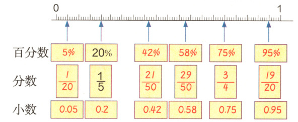 7. 分别用百分数、分数、小数表示直线上的各点。