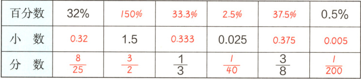 32%; 150%; 33.3%; 2.5%; 37.5%; 0.5%; 0.32; 1.5; 0.333; 0.025; 0.375; 0.005; $\frac{8}{25}$; $\frac{3}{2}$; $\frac{1}{3}$; $\frac{1}{40}$; $\frac{3}{8}$; $\frac{1}{200}$