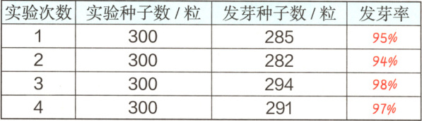 6. 生物小组进行玉米种子发芽实验,每次实验结果如下。请你计算每次实验的发芽率。 提示:发芽率=$\frac{发芽种子数}{试验种子总数}$×100%。