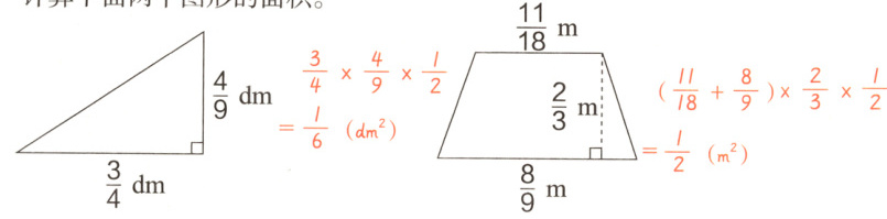 $\frac{3}{4}×\frac{4}{9}×\frac{1}{2}=\frac{1}{6}$(dm²)$\frac{11}{18}$m $\frac{2}{3}$m $\frac{8}{9}$m ( $\frac{11}{18}$+$\frac{8}{9}$ )×$\frac{2}{3}$×$\frac{1}{2}$=$\frac{1}{2}$(m²)