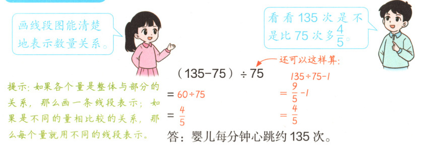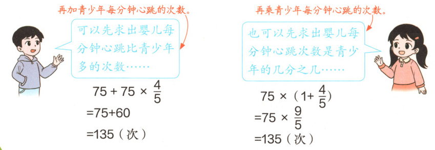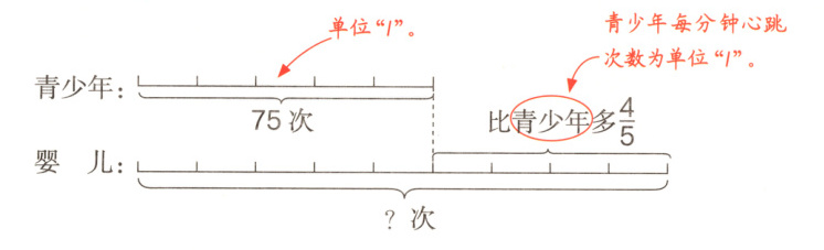 婴儿每分钟心跳的次数比青少年多$\frac{4}{5}$,多的部分是 的$\frac{4}{5}$。