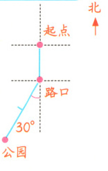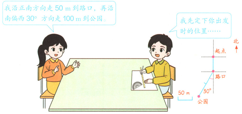 我沿正南方向走50 m到路口,再沿南偏西30°方向走100 m到公园。
