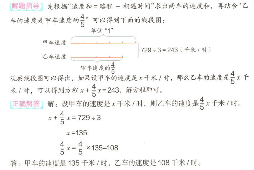 甲、乙两列火车分别从相距729 km的A、B两地相向而行,3小时后相遇,已知乙车的速度是甲车速度的$\frac{4}{5}$,求甲、乙两车的速度。