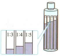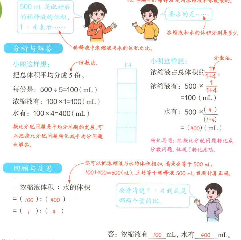 2 李阿姨按1:4的比配制了一瓶500 mL的稀释液,其中浓缩液和水的体积分别是多少?