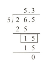 解题思路: 竖式中画框的“15”中的“1”,是被除数中的“26”除以5商5余下的1个一,“15”中的“5”,是被除数十分位上的“5”落下来的,表示5个十分之一,它们合在一起,即竖式中画框的“15”表示的是15个十分之一。