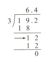 1. 小文花19.2元买了3支笔,平均每支笔多少钱?如右图的竖式中,箭头所指的“12”表示(
