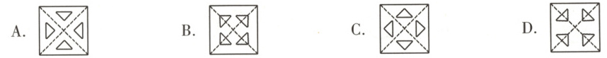 如下图所示,把一张正方形纸按图①、图②的方式对折两次后,再按图③的方式剪一个三角形小孔,则展开后得到的图形是(