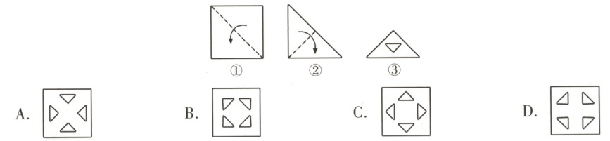 解题思路:可以把对折时的折痕画出来(如下图所示),通过对照折痕与三角形小孔的位置关系判断哪个是展开后得到的图形。