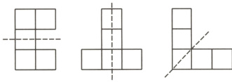 第一关:在下图中各添加一个小正方形,使它成为一个轴对称图形,并画出对称轴。