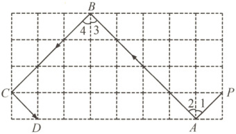 第三关:如图,弹性小球从点$P$出发,沿所示方向运动,每当小球碰到长方形的边时反弹,反弹时入射角等于反射角(即$\angle1 = \angle2$,$\angle3 = \angle4$),小球从$P$点出发第$1$次碰到长方形边上的点记为$A$点,第$2$次碰到长方形边上的点记为$B$点,……,第$2025$次碰到长方形边上的点为图中的(