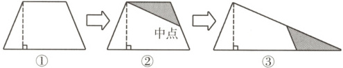第三关:一个梯形可以转化成一个三角形(如图)。如果梯形(图①)的面积是$16 m^2$,高是$4 m$,那么大三角形(图③)的底边长为(