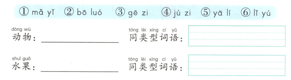 二、给下列音节词分类(填序号),再写出一个同类型的词语。