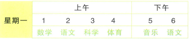 1. 乐乐在收拾书包,看到星期一的课程表,一共有