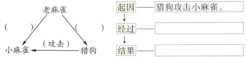 六 照样子补全思维导图,说说这件事的经过、结果,再填空。