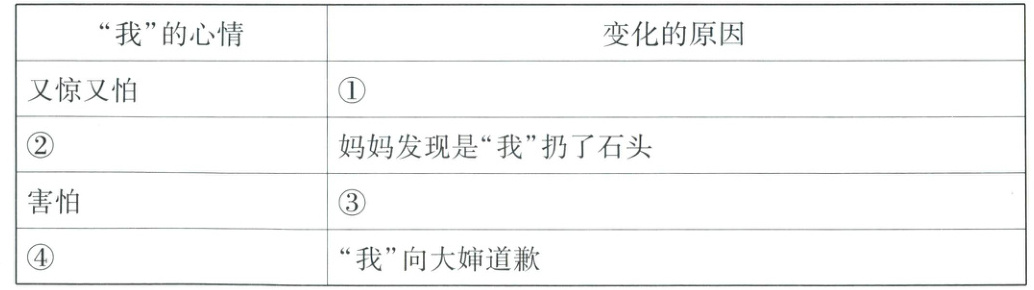 2. [ 整体感知 ]通过人物的动作、语言、神态等体会人物的心情变化。短文中“我”的心情有怎样的变化?原因是什么?结合短文内容填写下表。